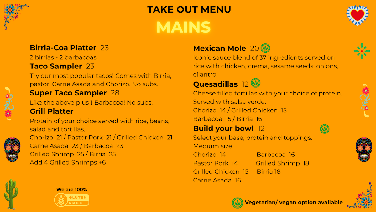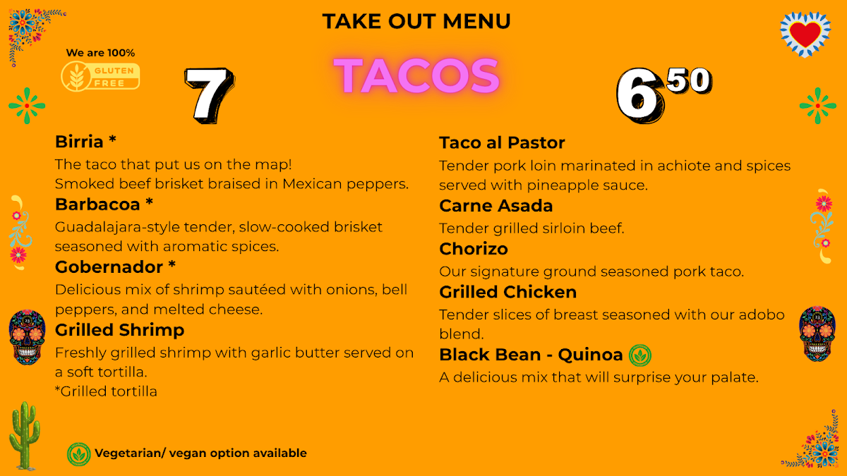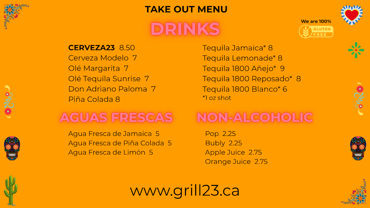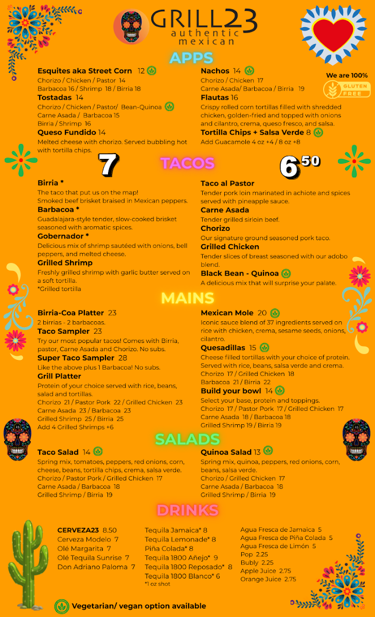 Introducing Grill 23 Authentic Mexican, a delightful culinary gem located in the heart of Ilderton, Ontario. This vibrant eatery specializes in serving genuine Mexican cuisine that transports your taste buds to the vibrant streets of Mexico. With a menu that features crowd-pleasers like the BirriaCoa Platter and enticing Taco Samplers, each dish is crafted with authenticity and care. Salads like the Taco Salad and Quinoa Salad offer fresh options, while sides such as creamy Guacamole complement every meal beautifully. Diners rave about the quality, freshness, and the cozy, take-out-friendly atmosphere. Customer reviews praise the friendly service and top-notch tacos that make every visit worthwhile. With its surprisingly affordable prices for a delightful range of dishes, Grill 23 truly stands out, making it an essential stop for Mexican food lovers in the area.